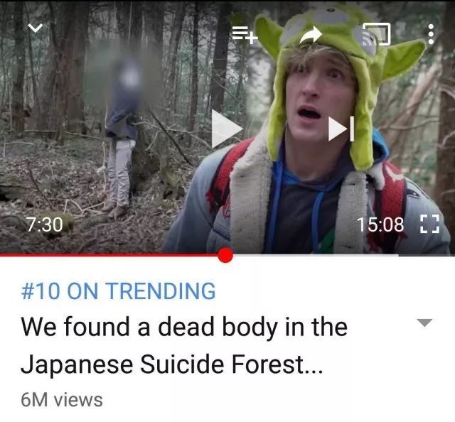 17年的最后一天,Logan上传了一则在日本著名的青木原(又称“自杀森林”)拍摄的视频。视频里,不仅有近距离接触一位因上吊身亡的死者的镜头,更有在尸体旁的一些不合适的举止,这种不考虑后果,不考虑受众,行为里透露出对亡者亵渎的拍摄,引发了群众极度不满和批评。