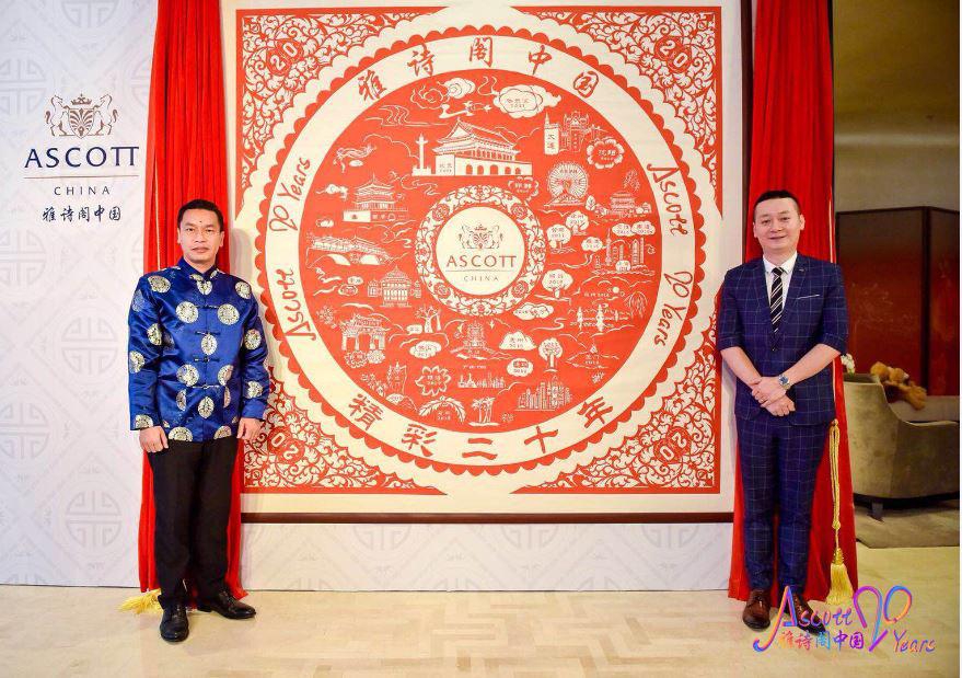 象征雅诗阁中国二十周年重大历程的非遗巨型剪纸作品揭幕,图左为陈志商