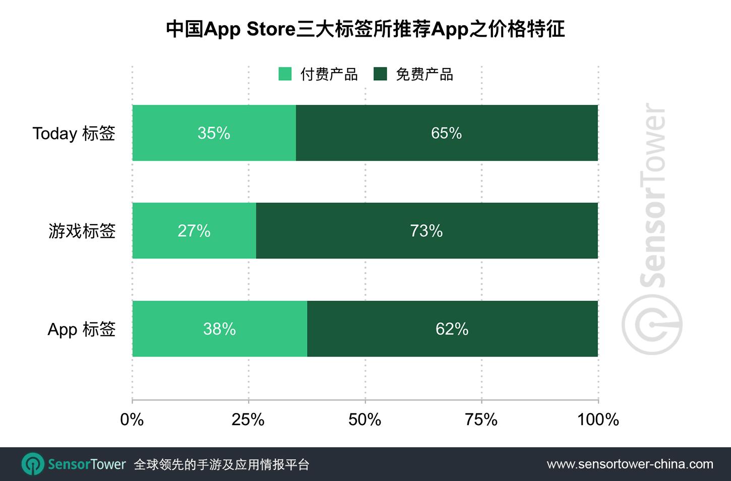 虽然目前App Store上大多数的App都是免费产品,中国App Store中三个不同标签对免费和付费App产品的推荐频繁度稍有不同。如以上图表所示,Today、游戏、和App标签均偏好免费应用产品,但游戏标签中的免费手游作品占比最大,达73%。Today标签中的免费App或手游占65%,而App标签精选推荐的付费App最多,占比38%。