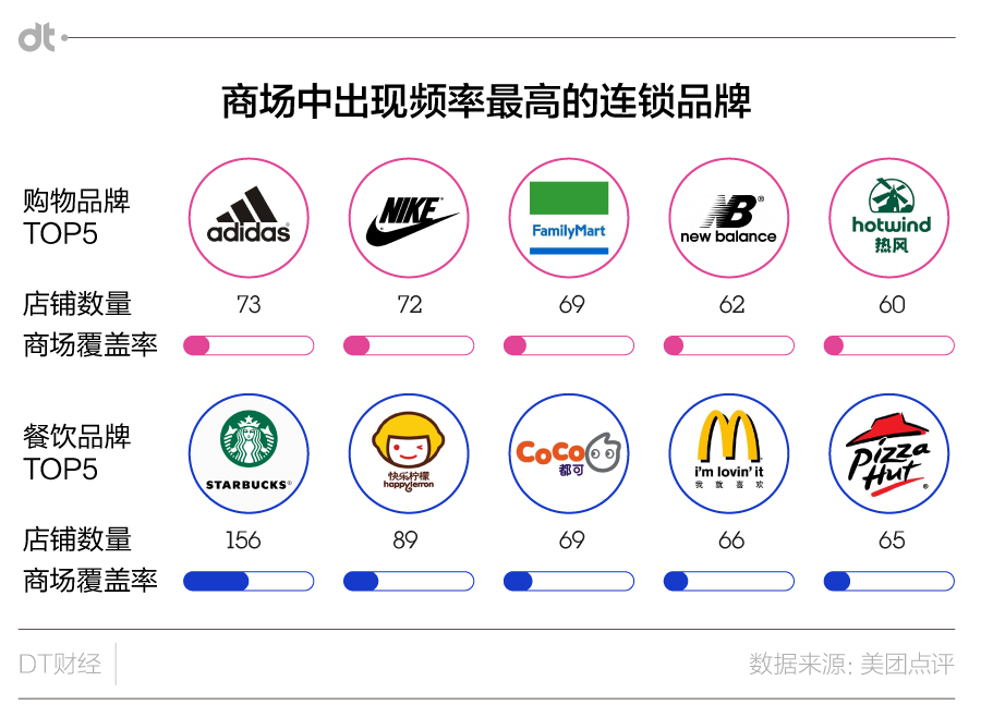 在购物品牌中,adidas和NIKE的覆盖实力不容小视,另一运动品牌New Balance也跻身前五,第6至9名则被几个大众快时尚品牌包揽——ONLY、VERO MODA、UNIQLO、JACK&JONES。餐饮方面,排在前列的也全是你们熟悉的味道。