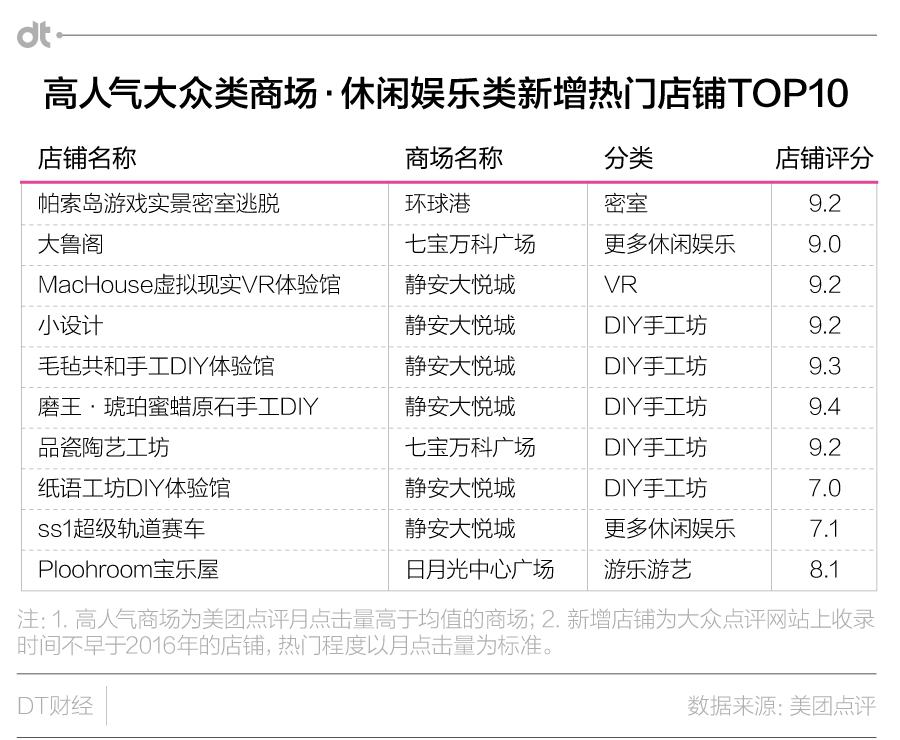 另外,比起传统大类餐饮和购物,不少嗅觉敏锐的商场,已经把关注点向运动健身和娱乐业态偏移了。这五个高人气商场的所有新增休闲娱乐类店铺中,月点击量前十名的店铺里有5家是各式各样的DIY手工坊。
