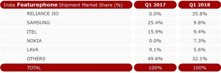 不过功能机最近开始重新席卷印度手机市场,让众多厂商措手不及。在智能手机增长平缓的情况下,2018 年印度手机市场第一季度机同比增长 48 %,主要的增长都是一款半智能机 jio Phone 带来的。