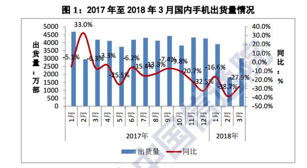 这个跌势还在持续,根据中国信息通信研究院发布的《2018 年 3 月国内手机市场运行分析报告》,2018 年 1-3 月,中国智能手机出货量为 8187.0 万部,同比跌幅达到 26.1%。