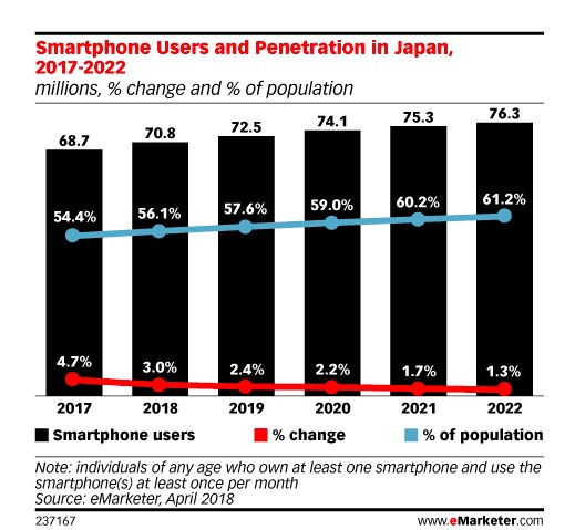 同样是发达国家的日本,智能手机的普及率却低得惊人,只有 54.4 %,分析机构 eMarketer 预测今年日本的智能用户有望达到 7080 万人,占总人口的 56.1%,还够不上全球的的平均值 (63 %)。
