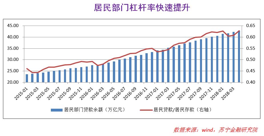 截止2018年4月末,居民部门贷款余额42.81亿元,较2014年末增长85%,而同期企业部门贷款余额仅增长37%。若以贷款/存款来简单衡量个人杠杆率(由于存款仅仅是个人资产配置的一部分,这么计算会高估个人部门负债水平,但从趋势上仍可反映个人的杠杆率变化),截止2018年4月末,个人杠杆率达到63%,较2014年末提高17个百分点(见下图)。