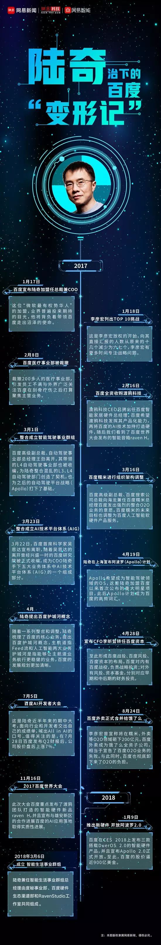 与之对应的,同样是在陆奇上任不到一个月的时间内,百度就裁撤了医疗事业部;7个月后的2017年8月,百度外卖被卖给了饿了么;而在陆奇离职前的前一个月,百度金融分拆。