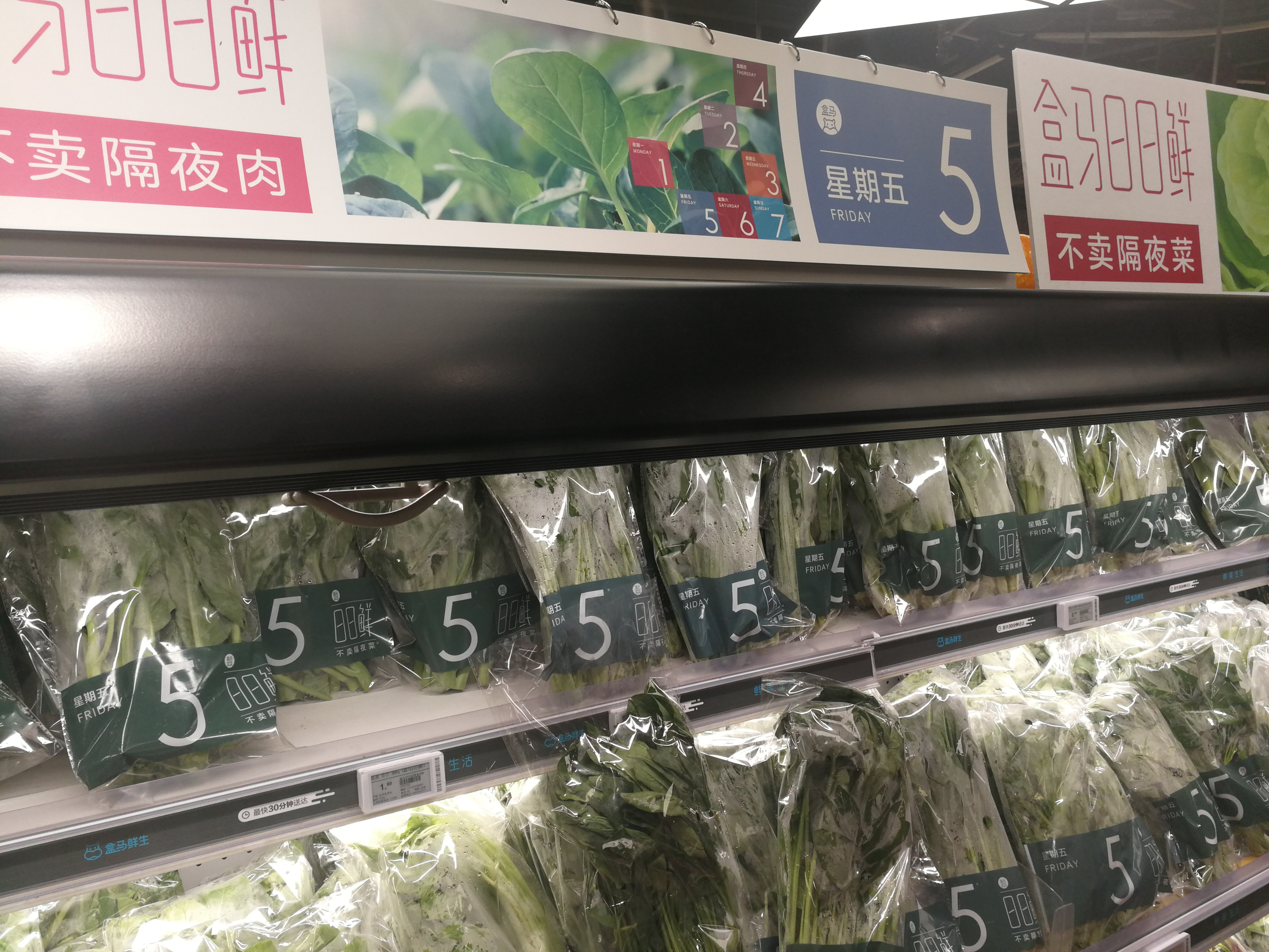 盒马鲜生有一个特别的生鲜专区叫日日鲜。每份蔬菜和肉类的包装袋上,都印着一个显眼的数字——“5”,当天正是星期五。这里的蔬菜“寿命”都只有一天,不同星期对应相应数字,且以不同颜色做以区分,正所谓“日日鲜”。