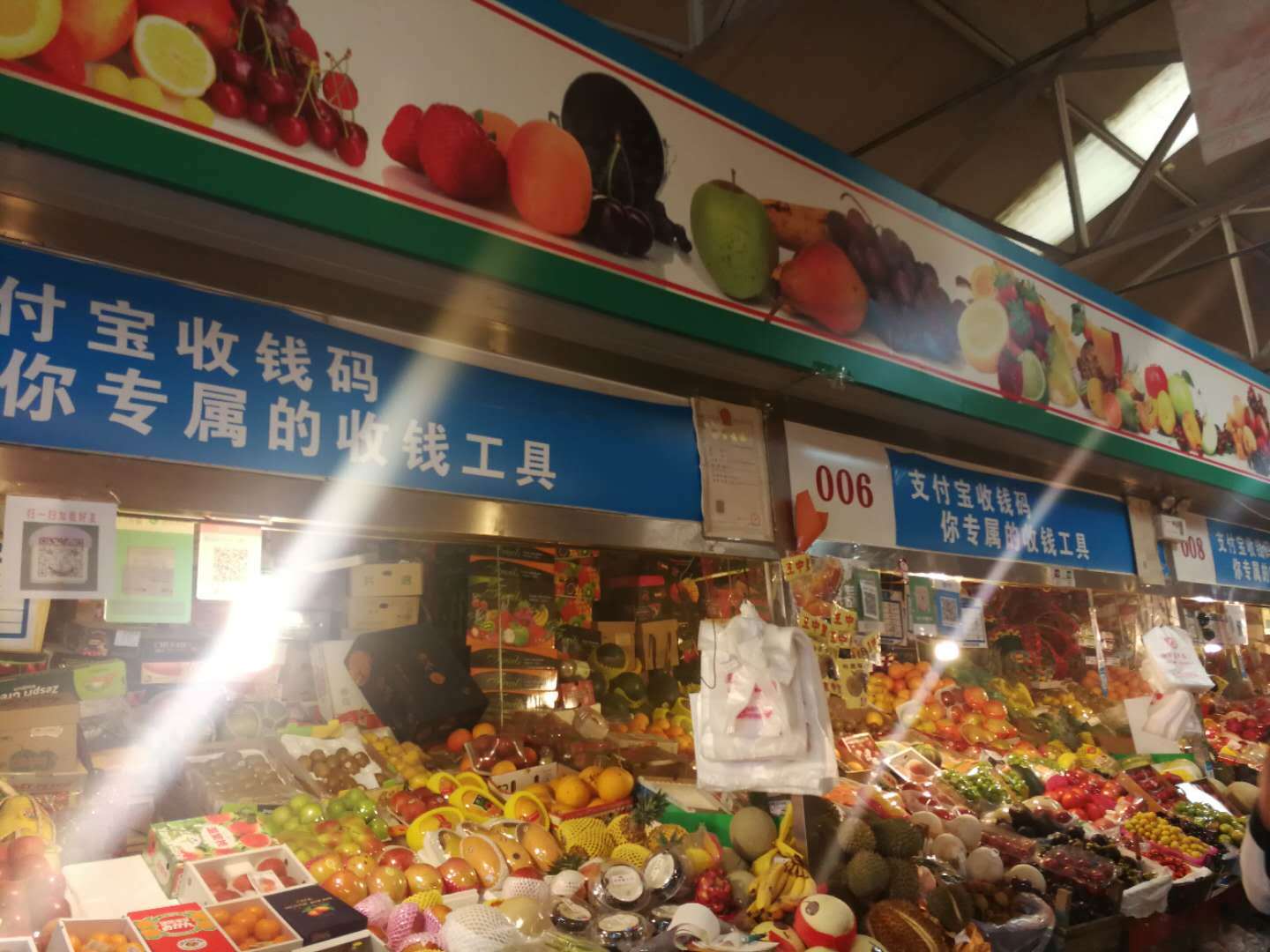 这是一个完全“支付宝化”的菜市场,每个摊位上都整齐划一地挂着支付宝收钱码的蓝色牌子。
