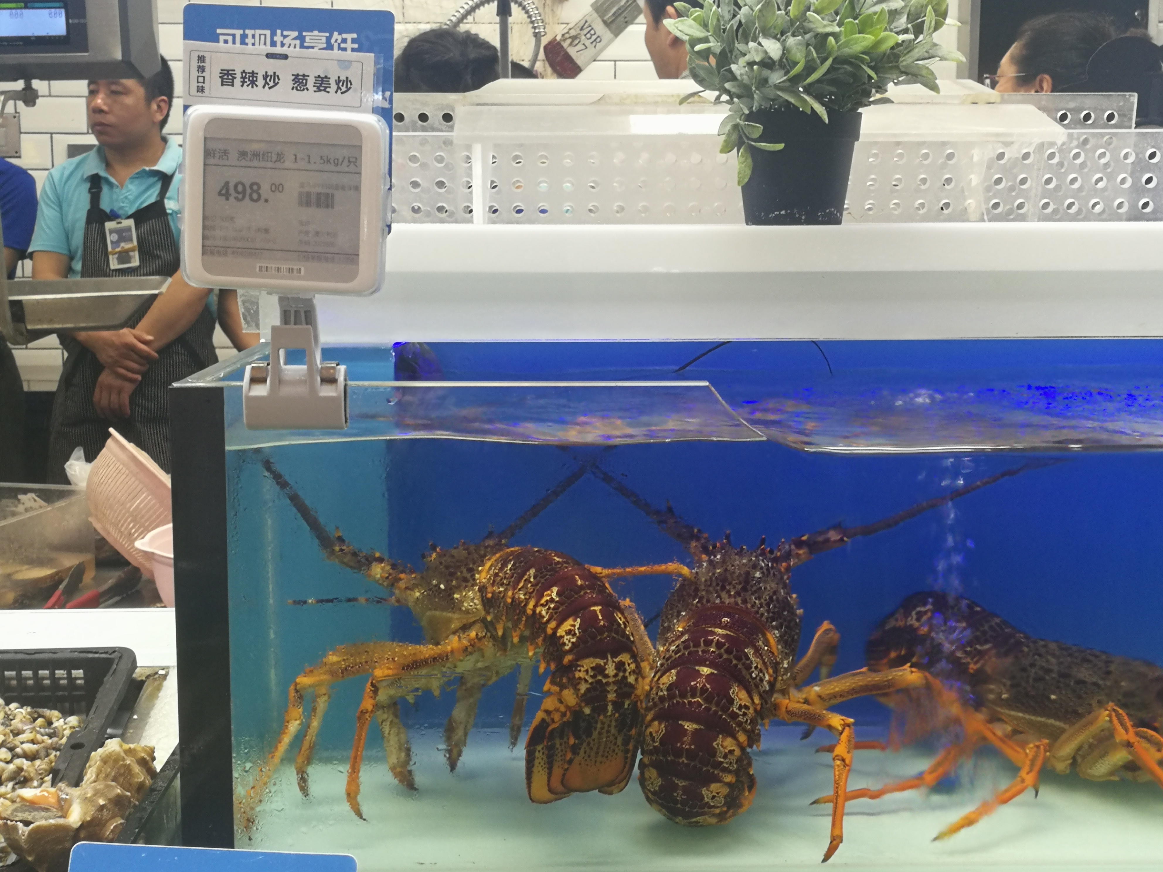 一踏进盒马,就被眼前肥硕的澳洲纽龙吸引了全部目光,入耳的是“咕噜噜”的水声。