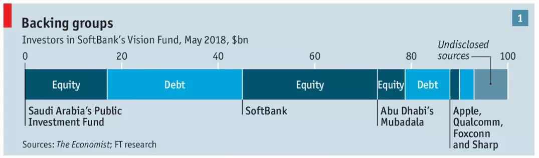 如果该基金的价值大幅下降,那么软银将首先失去 280 亿美元。在已知的外部投资者投入的资金中,有超过 60% 的资金都是债务形式的,这些投资每 6 个月就有 7% 的利息。