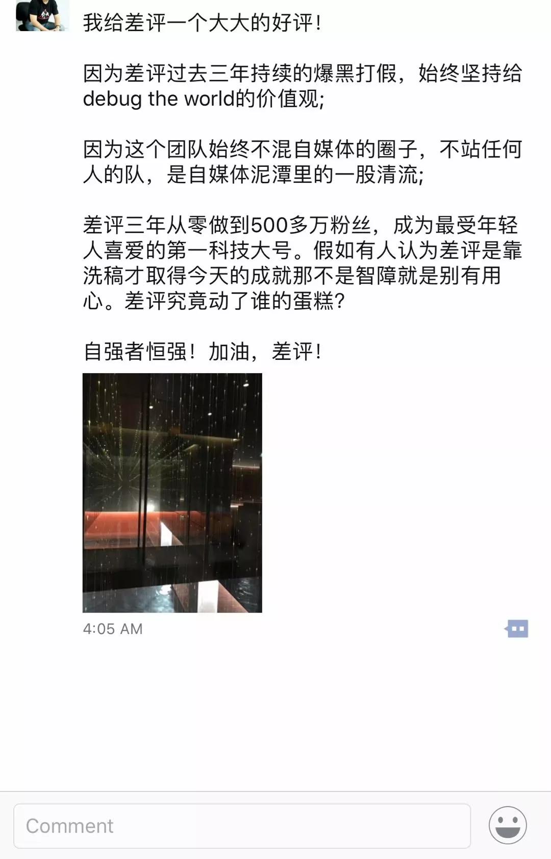 我之所以更关注投资内容的思路不应该是收割流量的思路,是因为我对差评的未来一点都不关心,是死是活我都不关心。差评死了,我们也未必活得更好,差评继续活下去,我们也死不了。只是差评想人五人六地跟其它科技媒体一起出现在各种新闻发布会的名单里,我们觉得有点像癞蛤蟆趴脚面上——不咬你但恶心你。但我觉得差评还能活得下去,肯定有人会投资它。我们投资圈的一些“老炮儿”是很鼓励年轻的“内容创业者”为了收割流量而不管不顾的。看看这位差评的天使投资人发的朋友圈就知道了。