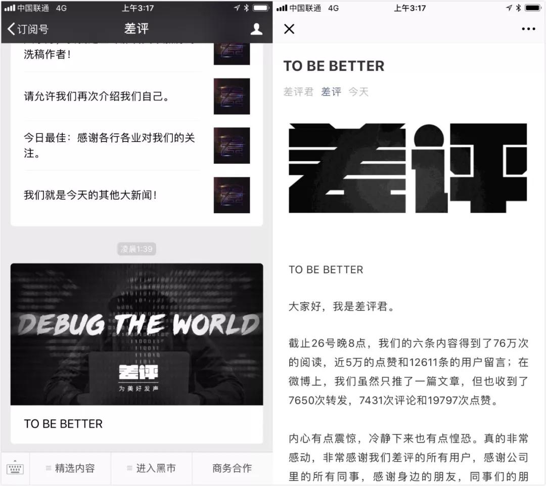 和昨天的6条强势推送相比,今天的差评理性多了,文章末尾也没有了“挺差评”的图,也不再号召“500万差友站起来,让他们听到不一样的声音!”
