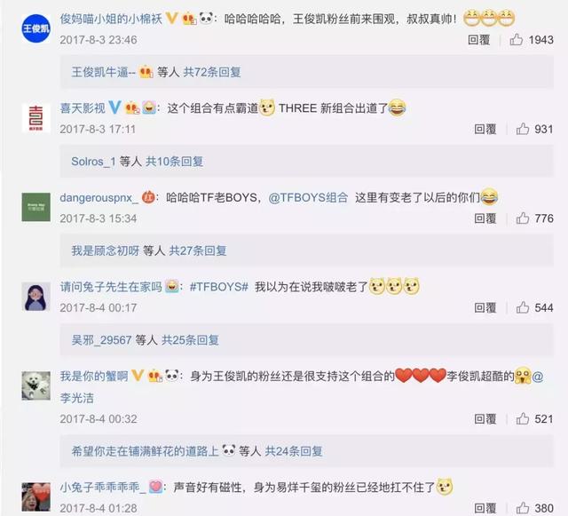 有意思的是,在TF老BOYS的相关微博下面,TFBOYS三个人的粉丝参与程度极高。除此之外,有更多的转发都是“自来水”。
