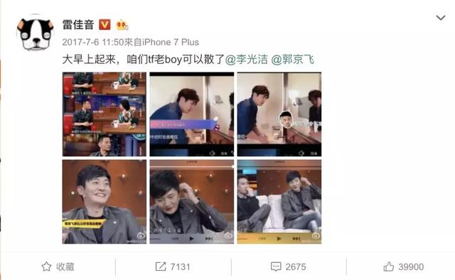 而TF老BOYS最初是雷佳音牵头组的一个微信群,雷佳音是易烊千玺、李光洁是王俊凯,郭京飞对应王源。直到2017年7月6日,雷佳音发布微博“咱们TF老BOY可以解散了”,这个梗才被广大网友熟知。