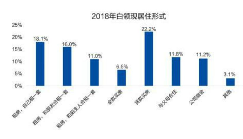 居住方面,报告显示,租房生活的白领人群占比最高,为45.1%。其中北上广深等买房压力大的一线城市中租房群体更庞大,北京租房生活的白领占比58.6%,上海为57.3%;深圳则高达68.8%。白领排名第二的居住方式为“贷款买房”,占比22.2%。