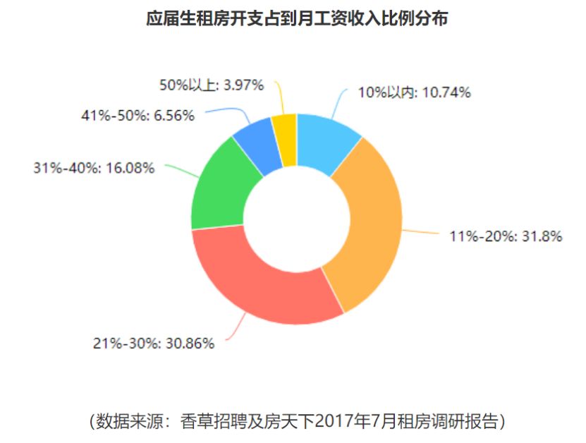 香草招聘联合房天下发布的《2017年应届生租房价格报告》显示,84.2%的应届生毕业生需要租房,近6成应届生每月租房开支占到月工资收入20%以上,其中超过10%应届生租房开支占到月工资收入40%以上。
