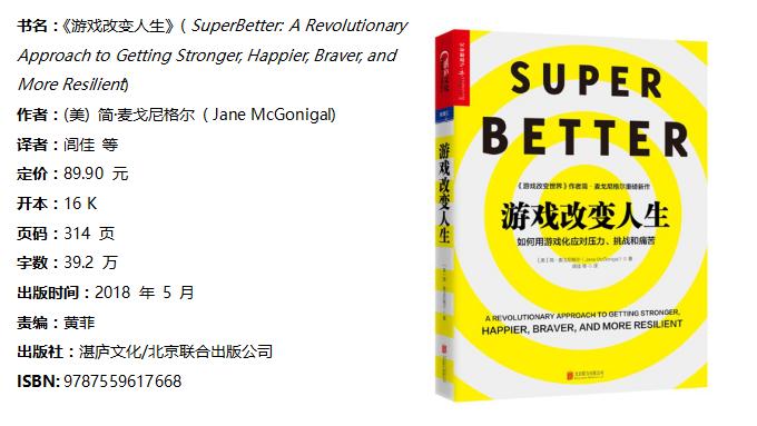 2009年,国际知名游戏设计师简·麦戈尼格尔遭遇了严重的脑震荡,她陷入了焦虑和沮丧,甚至想到了自杀。但她并没有消沉下去,而是把自己的恢复过程变成了一个复原力建设的游戏:SuperBetter。她在博客中分享了一套“创伤后成长”的规则,原本只是给自己设计的激励练习,没想到在美国迅速发酵。如今,美国有40多万人通过这款SuperBetter获得了个人成长,变得更加快乐和健康。SuperBetter也成为了美国国家卫生研究院的大型研究项目。