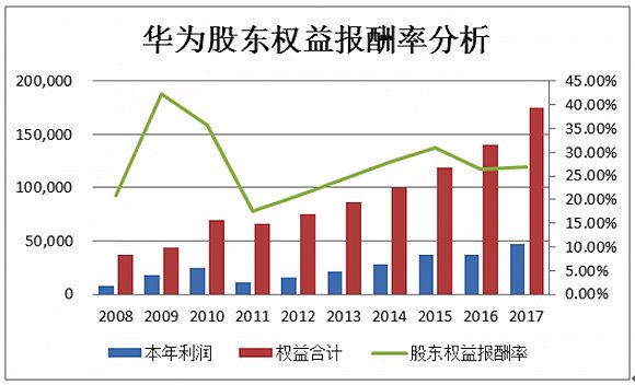 华为是一家非上市公司,缺少公开募集股本的资料,我们也难以追溯华为股东的原始投入。仅仅根据过去10年的财报而言,累计实现税后净利润2483.95亿,加权平均股东权益报酬率27.22%。2017年度,公司实现税后净利润474.55亿元,股东权益合计期末余额1,756.16亿元,股东权益报酬率27.02%,接近过去10年的平均水平。