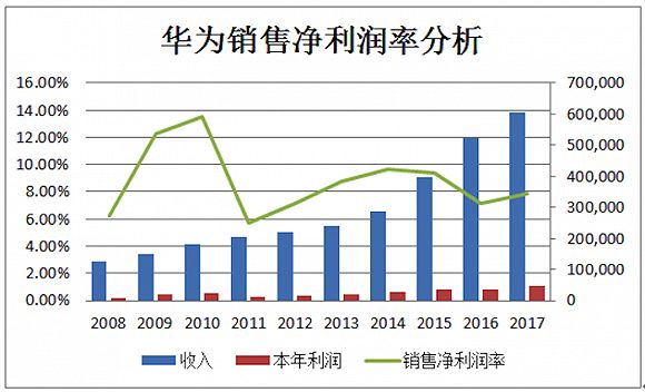2017年度,华为实现税后净利润474.55亿元,较2016年度370.52亿元增长28.08%。与2008年的78.48亿元相比,增长6.05倍,平均复合增长率22.13%。