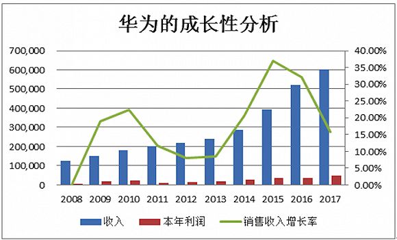 2017年度,华为全球销售收入6036.21亿元人民币,与2016年度的5215.74亿元相比,增长15.73%。与2008年的1252.17亿元相比,增长4.82倍,平均复合增长率19.09%。