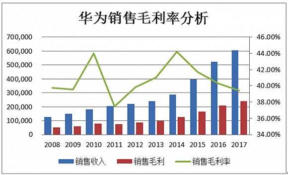2017年,公司销售毛利率为39.45%,较上年40.29%略有下降。过去10年,华为的销售毛利率非常稳定,其中最高的年份为2014年,达到44.22%,最低的年份为2011年,为37.49%,10年来的加权平均销售毛利率为40.69%。