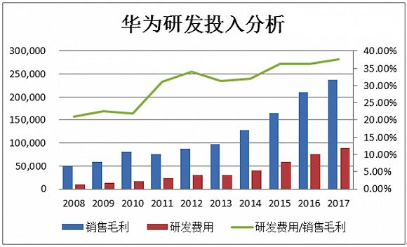 2017年度,华为投入研发费用896.9亿元,占当年度销售毛利的37.66%,无论是在投入金额还是占销售毛利的比重上,都创出历史新高,为历史最高水平。这充分表达了公司管理层在研发投入上奋起直追的愿望。让国人敬佩,让对手望而生畏。