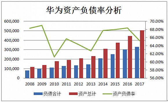 再就公司的财务风险控制来看。2017年末,华为资产总额为5052.25亿元,负债总额为3296.09亿元,资产负债率为65.24%。纵观过去10年的资产负债率水平,始终保持在60%-70%区间,10年加权平均资产负债率为66.24%。当我第一次看到这一结果时,也曾在心里怀疑华为的10年报表数据是不是刻意造出来的?因为它的稳定性类似于教科书的案例。即便如此,我也宁愿相信华为的财报所表达的出来的正是华为本身的事实而非捏造。所以,又忍不住要再为华为的理财点个赞。