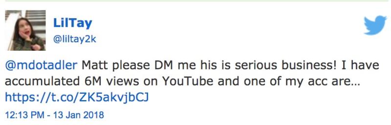 在反复沟通之后,Gelbard同意通过电子邮件的形式回答一些问题。我一直没有收到问题的回复,而在接下来几天时间内,有些奇怪的事情发生了,也许这暗示着一场幕后冲突。Tay的Instagram账号突然宣布她被软禁在家中,没法碰到手机,呼吁粉丝们通过发布带有#FreeLilTay标签的推特来营救她。当天晚上迟些时候,Tay在Instagram Stories上发布了一则讯息,表示:“没有任何人在管控Lil Tay。我是独立的。任何商业方面的业务需求,请发送邮件。”
