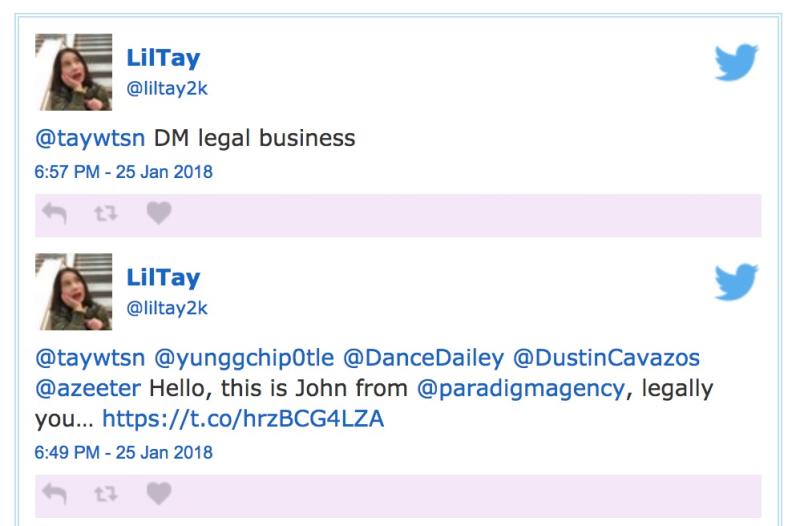 另一个疑惑就是Tay目前已被删除的Twitter账号。在其账号被删除之前——也许是因为账号使用者是一位未成年——该账号发送了大量推特,对于Tay的Instagram被停用一事表达了愤怒。一部分内容似乎在表达这些推特都是由Paradigm的代理人编写的,这是一家在10个城市拥有办事处的大型人才机构。