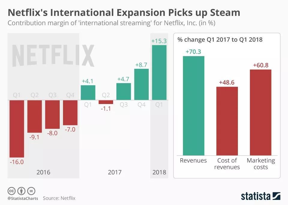 同比2017Q1,2018Q1Netflix在利润上增长了70.3%