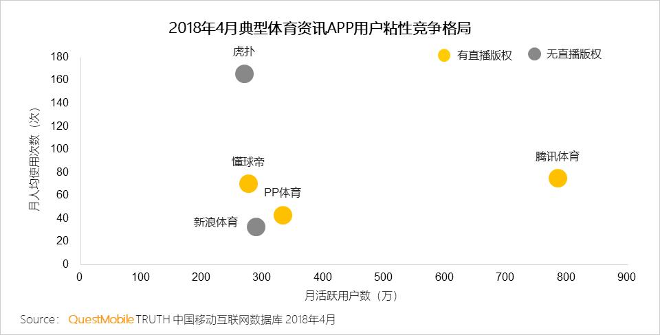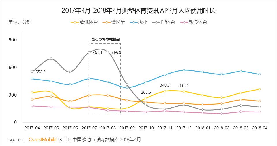 QuestMobile数据显示,以PP体育为例2017年通过体育直播版权上的优势,欧冠赛事期间7月人均使用时长环比增长38%,腾讯体育以查看赛程的特点2017年10月人均使用时长环比增长69%。
