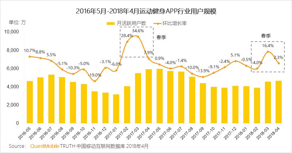 春夏两季是运动健身集中期,为夏季秀健美做准备,每年2-3月都有新一批的健身人群加入,带来用户规模的集中增长。