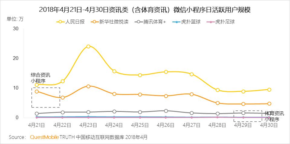 QuestMobile数据显示,资讯类小程序还较少,用户DAU排在前列的主要为传统媒介的小程序。体育资讯类小程序上线后流量平平。