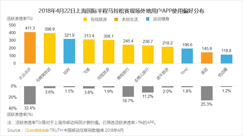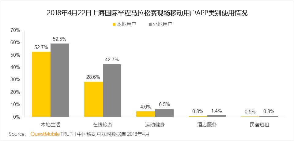 上海国际半程马拉松赛当天是周末,外地用户多半会选择顺道旅游,故在本地生活、在线旅游、酒店服务等旅游相关类APP的渗透率显著较高。