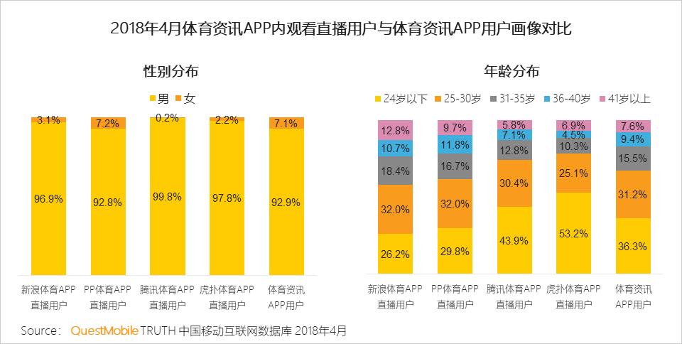 体育资讯的主体用户是男性,不同年龄用户观看直播使用APP各有偏好,虎扑体育和腾讯体育的用户更年轻化。