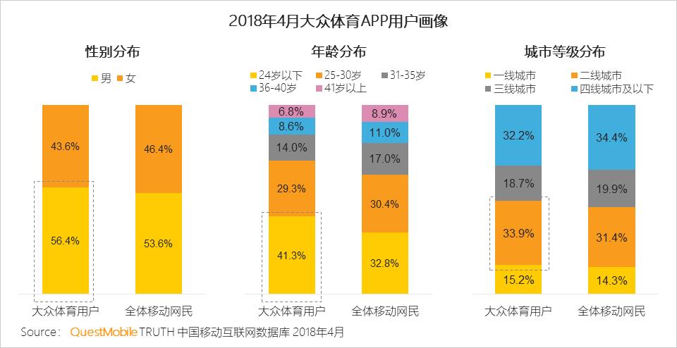 大众体育+移动互联网用户相较移动网民整体特征更偏年轻化,其他特征基本一致,大众体育受场景和专业限制较小,吸引各等级城市用户、各年龄用户参与其中。