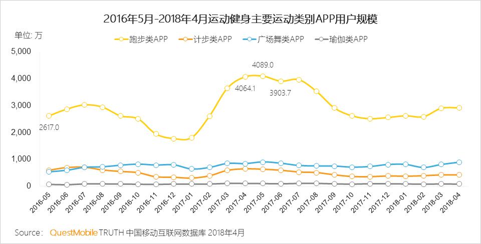 QuestMobile数据显示,2017年4月跑步类APP活跃用户数超过4000万,占运动健身用户的80%,较2016年同期增长超过50%,之后进入平稳阶段,坚持下来的用户将成为运动健身的忠实用户。