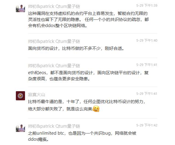 他表示:“面向货币的设计,比特币做的不多不少,刚好合适。eth和eos,都不是面向货币的设计,面向区块链平台的设计,复杂度很高,也蕴含更多安全隐患。”