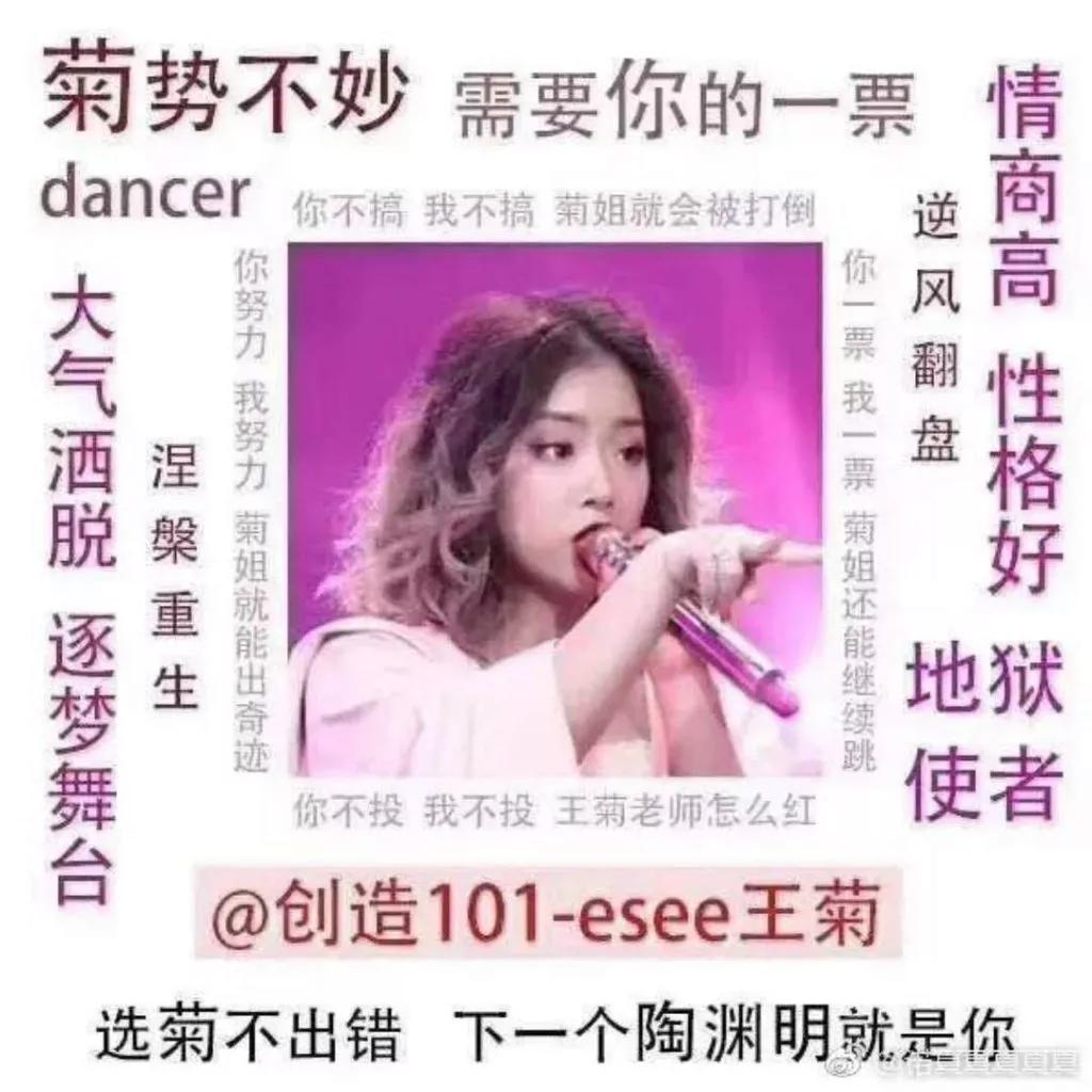 第 5 期之后突然到处都是菊姐的通稿,文案统一都是王菊其实以前很漂亮,这样又努力又有实力的人为什么不能 pick…… 以我混迹饭圈多年的经验来看,没人推才有鬼,这种套路一眼就能看出来。