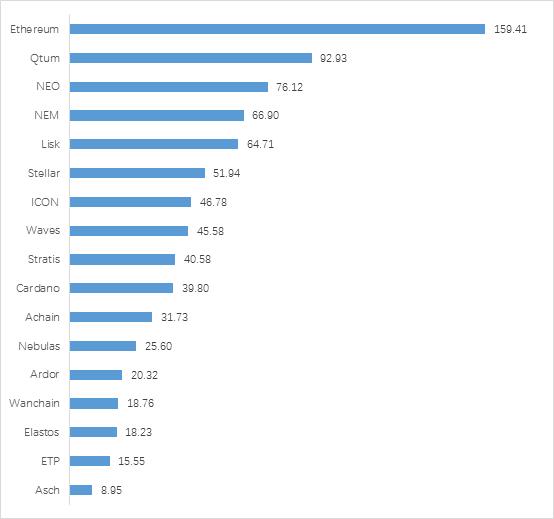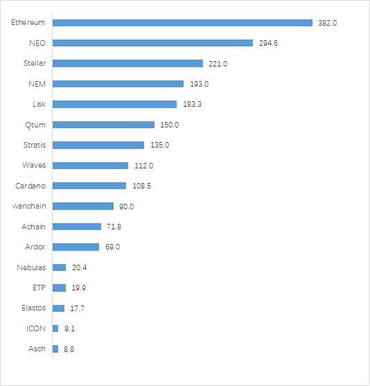 截至2018年5月18日,Ethereum市值为668.75亿美元,市值最高。已上线主网项目中,Cardano、Stellar、NEO颇受市场青睐,截止2018年3月31日,市值分别是62.96亿美元、58.20亿美元、37.52亿美元。