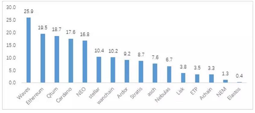 平台主网的平均开发周期为10.2个月,在主网已上线平台中,Waves的主网开发周期最长,Ethereum的主网开发周期位居第二。