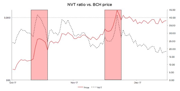 去年12月,当比特币接近两万美元时,其NVT比率依然处于一个较低的水平,随后比特币价格在一周之内回调30%。