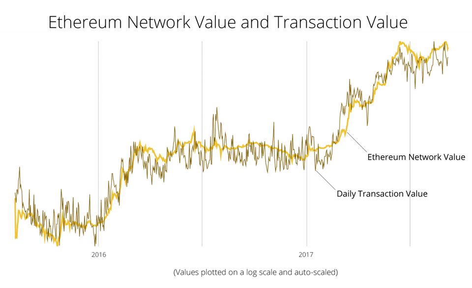 公式中分子上的“加密货币网络价值”指的是加密货币的交易价格乘以流通总量,即“市值”;而对比市盈率来看,由于加密货币和企业不同,它没有盈利,所以就用代表区块链潜在效用的“每日交易量”来体现其业绩指标。在这里需要强调的是,因为发生在交易所的交易大部分属于投机行为,所以NVT中所用的日交易量只考虑链上交易。