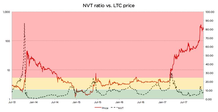使用改良后的NVT比率对莱特币进行评估,自2013年以来,莱特币价格的峰值与90天均线的NVT比率至少发生了三次重合。