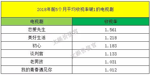 2018年上半年几乎快要过去了,电视剧行业宛如一潭死水,毫无波澜。前五个月,上星首播电视剧共有超过50部,平均收视率破1的电视剧只有六部:《恋爱先生》1.561、《美好生活》1.218、《初心》1.183、《谈判官》1.133、《老男孩》1.031、《我的青春遇见你》1.012。