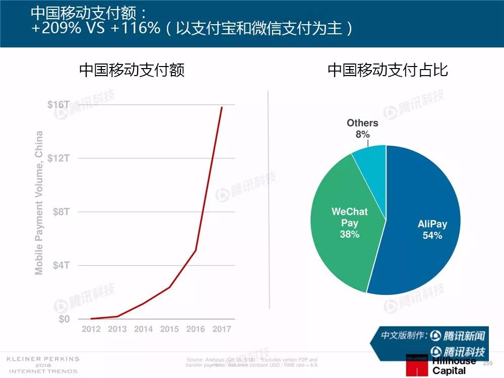 在移动支付的普及率上中国继续引领全球,2017年移动支付用户超过5亿人。