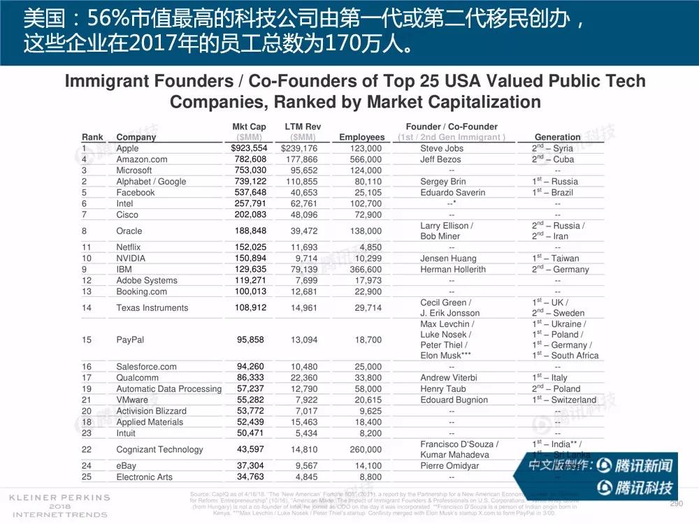 移民对美国科技公司仍然非常重要。美国半数以上的高市值科技公司是由第一代或第二代移民创办的。Uber、特斯拉、WeWork和Wish的创始人均为第一代移民。