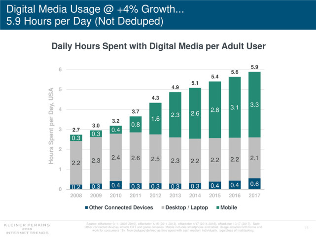 人们仍然在增加他们在网上花费的时间。2017年,美国成年人每天在数字媒体上花费5.9小时,高于前一年的5.6小时。其中约3.3小时用于手机,这是数字媒体消费全面增长的原因。