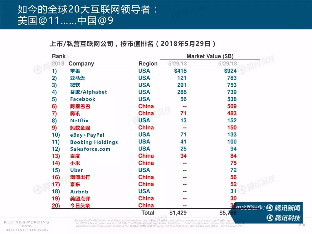 当前,在全球市值最高的20家互联网公司当中,中国占据了9家,美国占据了11家。5年之前,中国占据了2家,美国占据了9家。