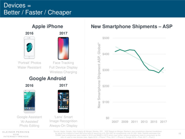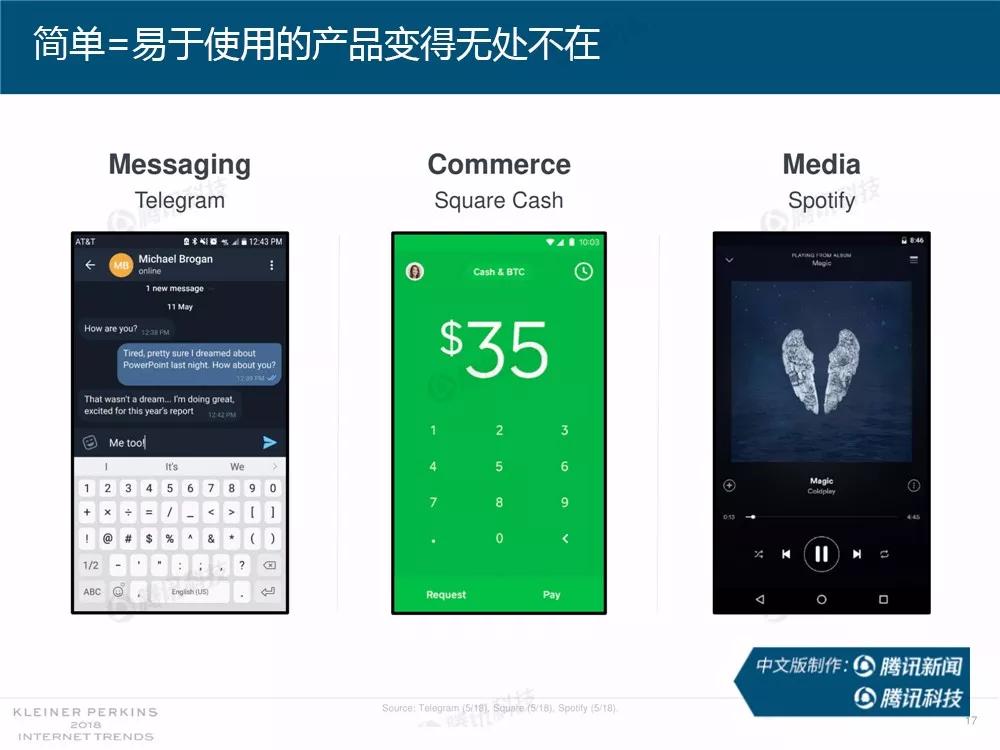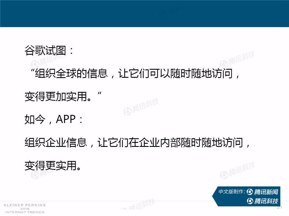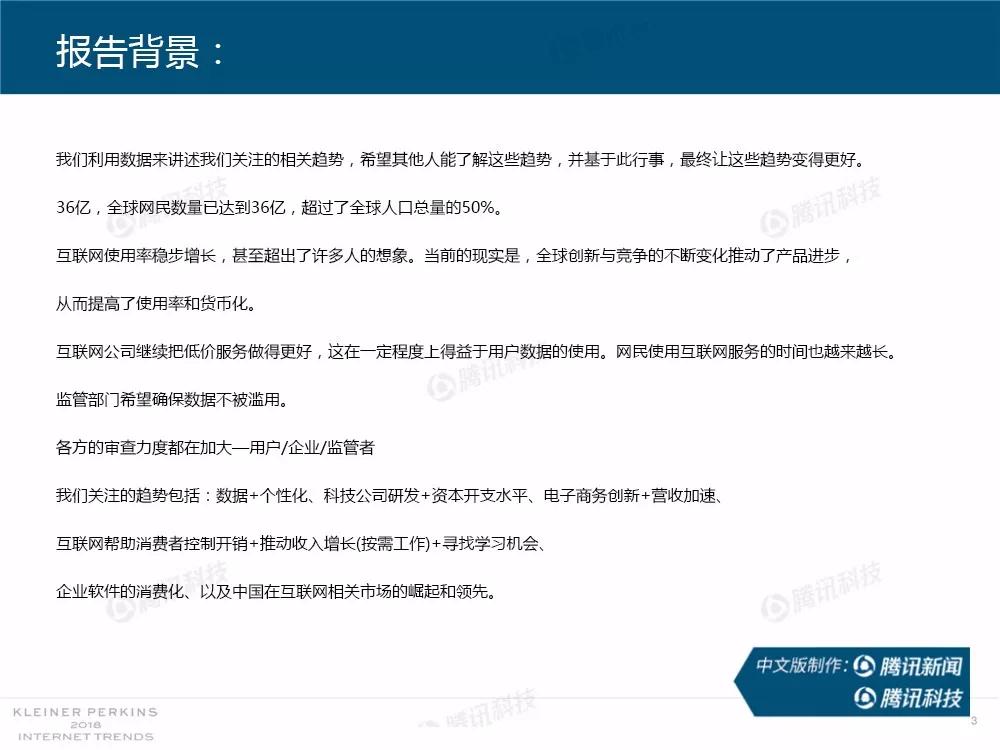 作为风投公司凯鹏华盈的合伙人之一,米克尔今年发布的互联网趋势报告共有294张幻灯片,内容涵盖从美国智能手机用户的行为、到中国科技公司的竞争等方方面面。
